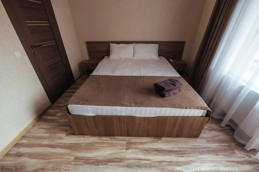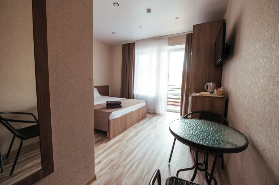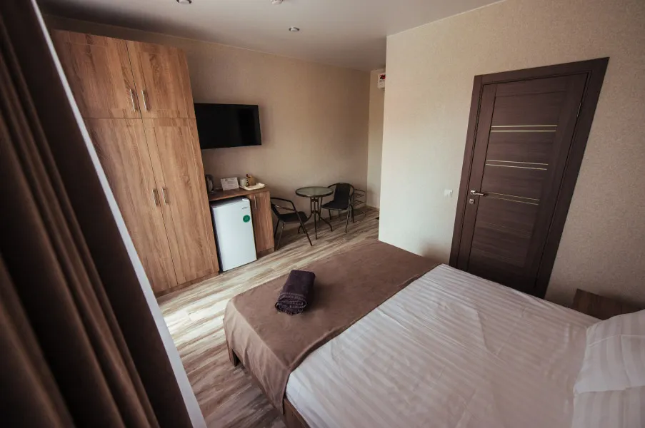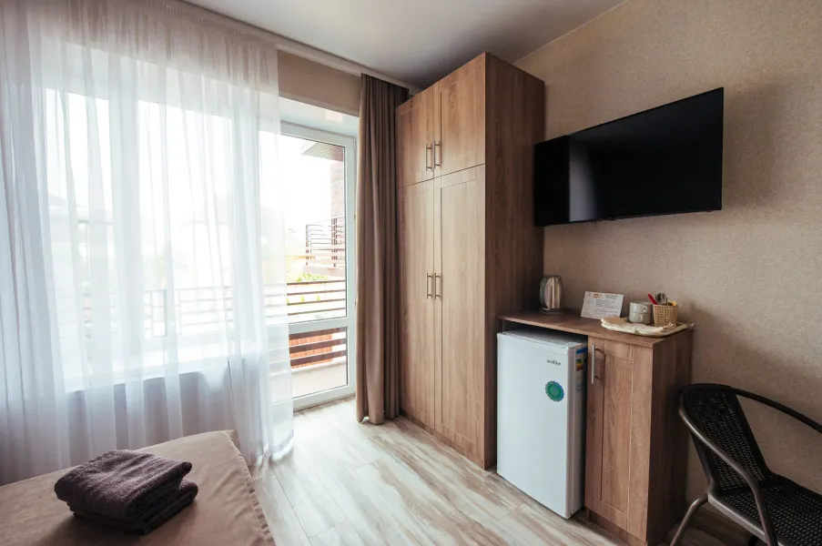 Стандарт – комфортный, двухместный номер. Номер на втором этаже имеет собственный балкон с прекрасным видом во двор. В номере к вашим услугам: - двухспальная кровать - шкаф для одежды - журнальный столик - кондиционер - холодильник - чайная станция - посуда - сушилка для белья -телевизор - Wi-Fi (как в номерах, так и на всей территории) - санузел (душ, умывальник , туалет, принадлежности для душа, полотенца, фен)
