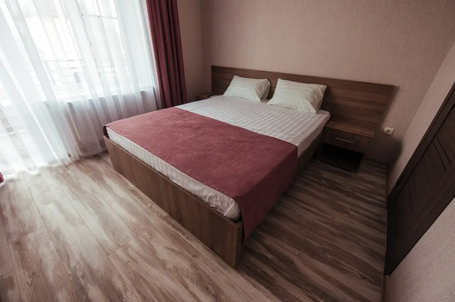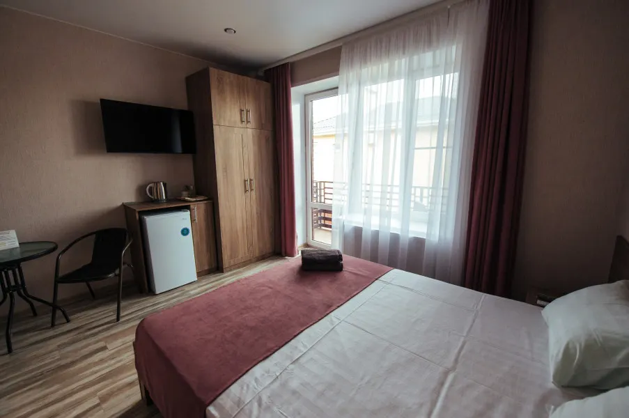 Стандарт – комфортный, двухместный номер. Номер на втором этаже имеет собственный балкон с прекрасным видом во двор. В номере к вашим услугам: - двухспальная кровать - шкаф для одежды - журнальный столик - кондиционер - холодильник - чайная станция - посуда - сушилка для белья -телевизор - Wi-Fi (как в номерах, так и на всей территории) - санузел (душ, умывальник , туалет, принадлежности для душа, полотенца, фен)