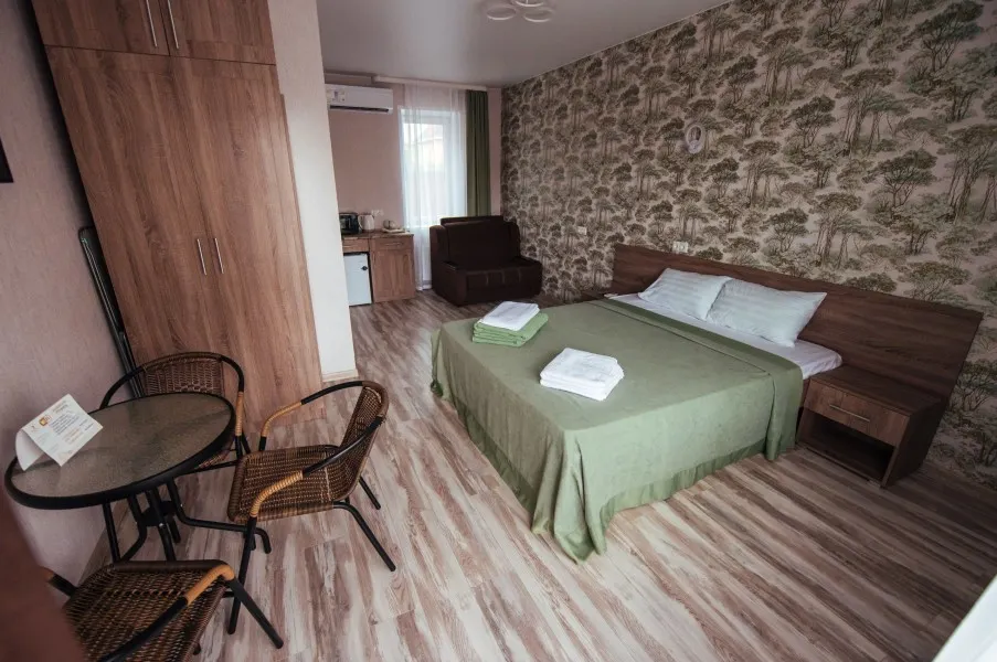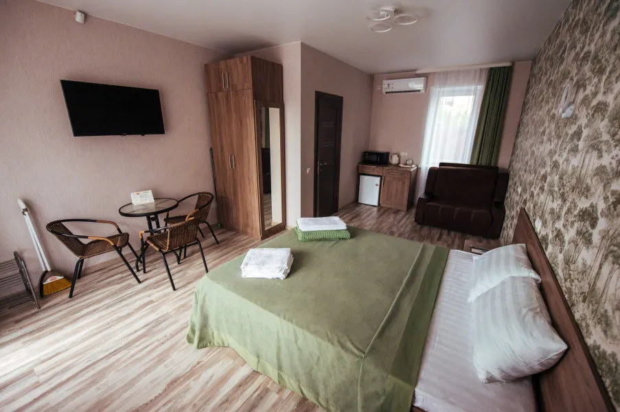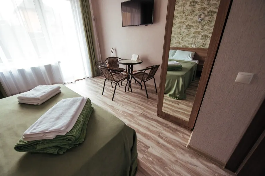 Трёхместный – уютный, светлый номер, для комфортного размещения семьи или компании взрослых. Номер с отдельным входом, расположенный на первом этаже гостевого дома.Имеет собственную террасу с обеденным столом и креслами. В номере к вашим услугам: - двухспальная кровать - одноместный диван - шкаф для одежды - журнальный столик - кондиционер - холодильник - микроволновка - чайная станция - посуда - сушилка для белья -телевизор - Wi-Fi (как в номерах, так и на всей территории) - санузел (душ, умывальник , туалет, принадлежности для душа, полотенца, фен)